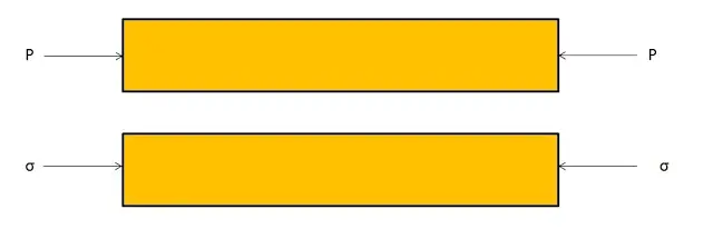 考虑一根长度为L的杆,横截面面积为a,施加在物体上的外力(载荷)为P。取横杆的x-x截面如图所示。截面左侧的载荷引起杆右侧的阻力R。如图x-x截面右侧的载荷在截面左侧产生了一个阻力R。在平衡状态下,阻力与外加载荷保持一致。抗力与横截面面积之比称为应力。