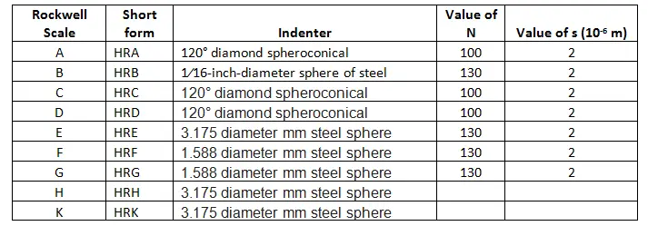 让我们快速浏览一些洛氏硬度标尺及其N, s值,以及在这些标尺中使用的压头类型。